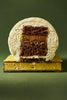 La bûche est présentée sur une tablette de chocolat noir, véritable création à part entière. Fourrée d’un praliné pistache généreux et parsemée de pistaches croquantes finement torréfiées, elle prolonge l’expérience gustative avec contraste et intensité.