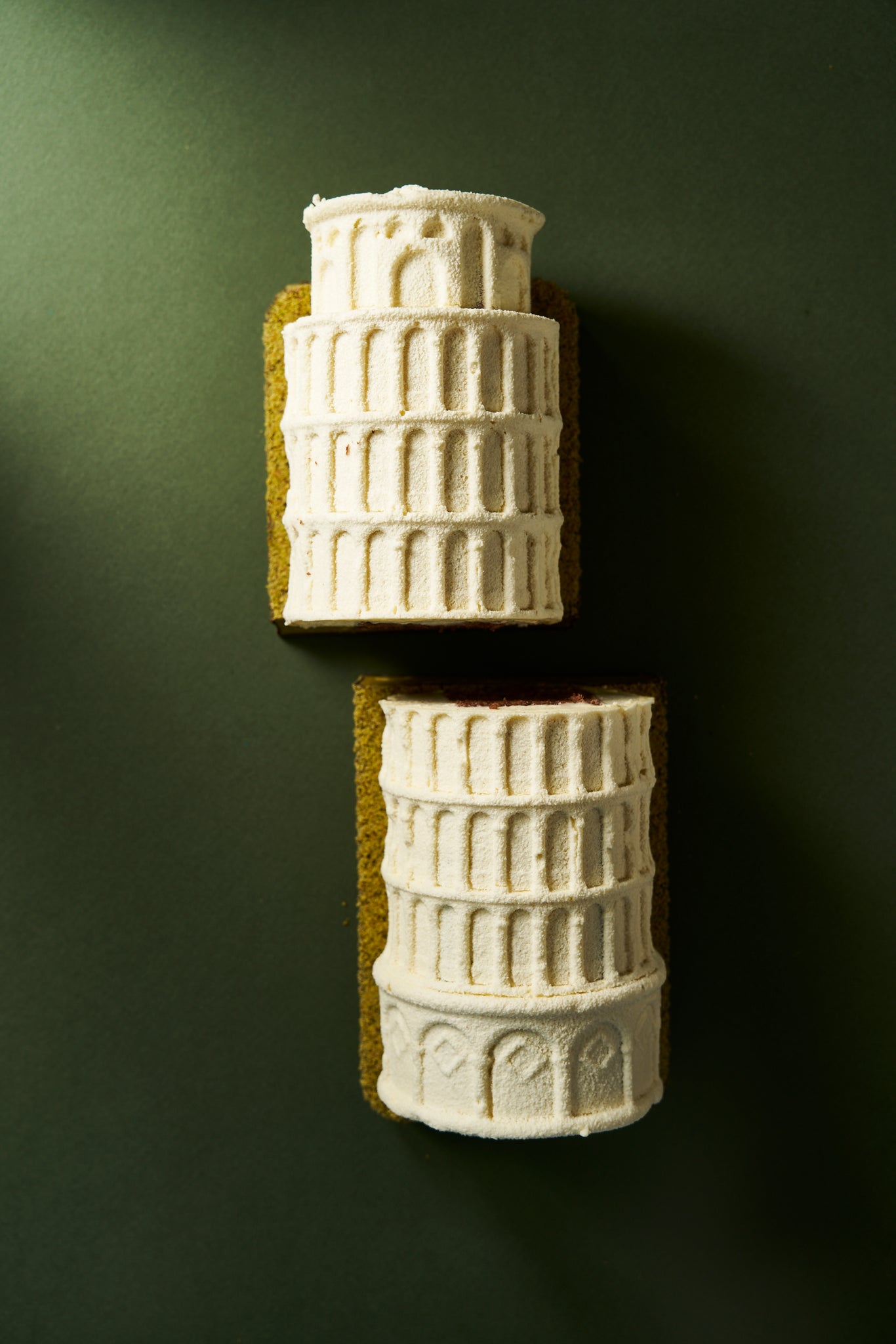 Pièce maîtresse de la collection, la Bûche Signature Tour de Pise célèbre l’Italie à travers une création aussi architecturale que gourmande. Sa forme cylindrique, inspirée de la célèbre tour inclinée, se distingue par une coque en chocolat blanc finement texturée, évoquant les détails emblématiques du moment : arcades sculptées, moulures délicates et colonnes en relief.
