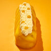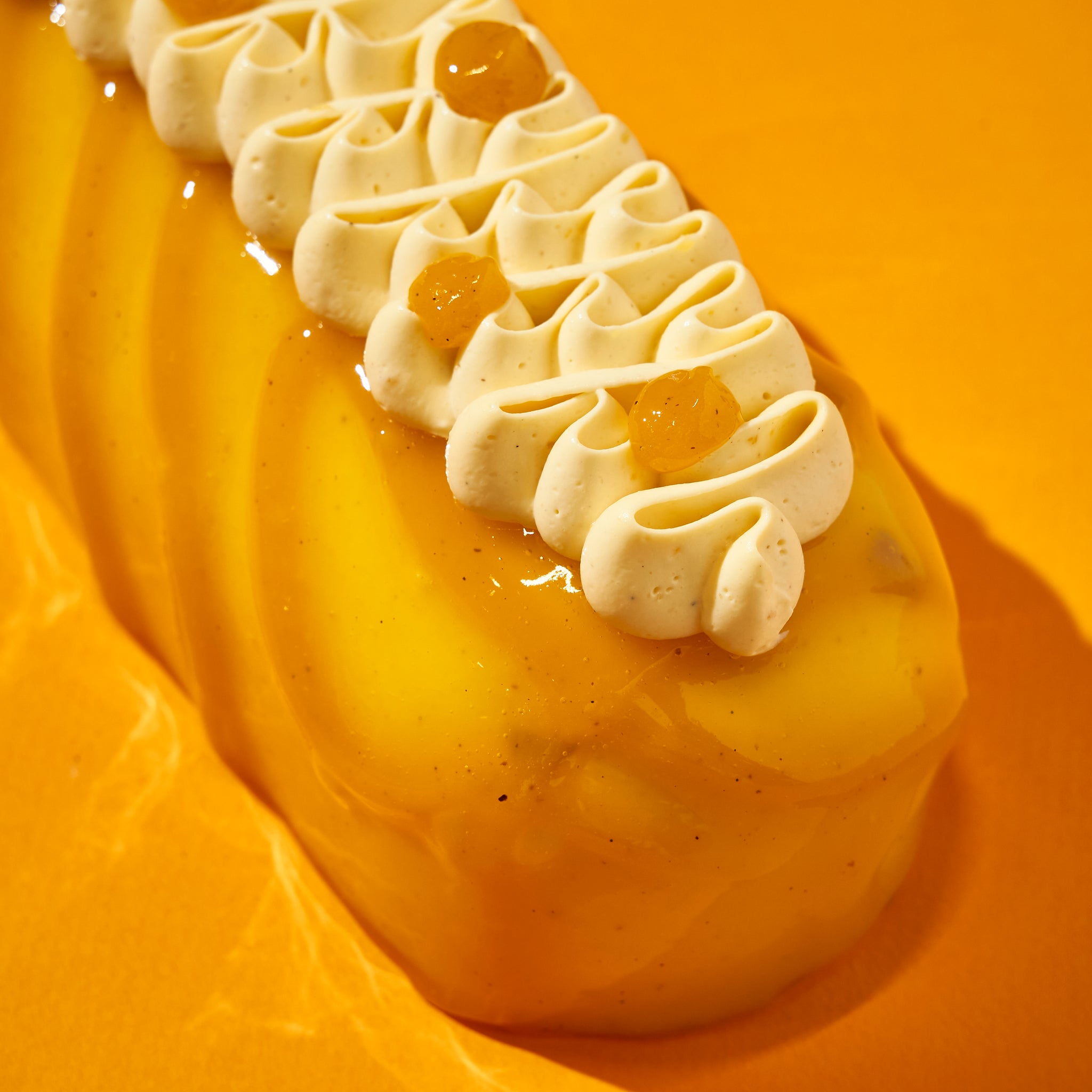 Sous un biscuit napolitain moelleux, un croustillant exotique se marie à un crémeux passion acidulée, une brunoise de mangue fraîche et un confit exotique parfumé. La ganache montée exotique vient envelopper ces saveurs solaires, pour une bûche aussi colorée que rafraîchissante.