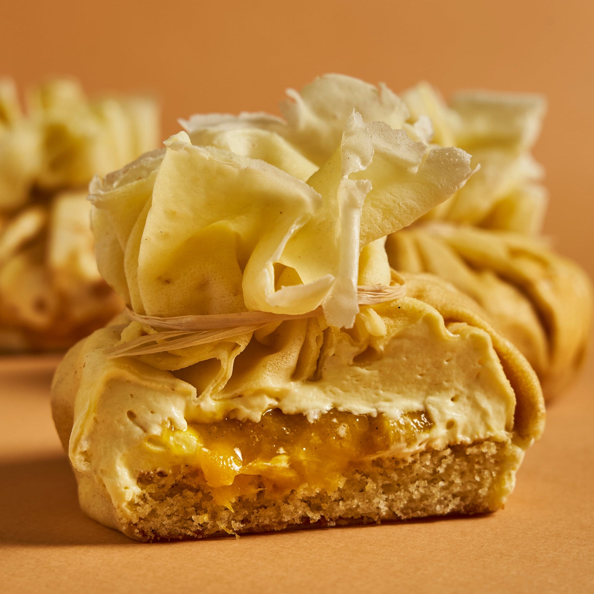 Ici, une crêpe aumônière exotique composée d'une crêpe parfumée à la vanille de Madagascar, d'un biscuit napolitain vanille, d'un confit de mangue, d'une brunoise de mangue et d'une ganache montée exotique.