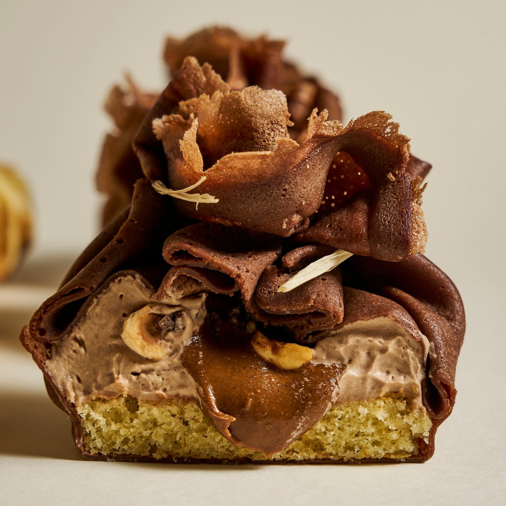 Ici, une crêpe chocolat praliné ultra gourmande composée d'une crêpe au cacao, d'un biscuit napolitain vanille, d'un praliné pur amande noisette, d'une ganache montée chocolat 64% du pérou et des noisettes torréfiées et concassées.