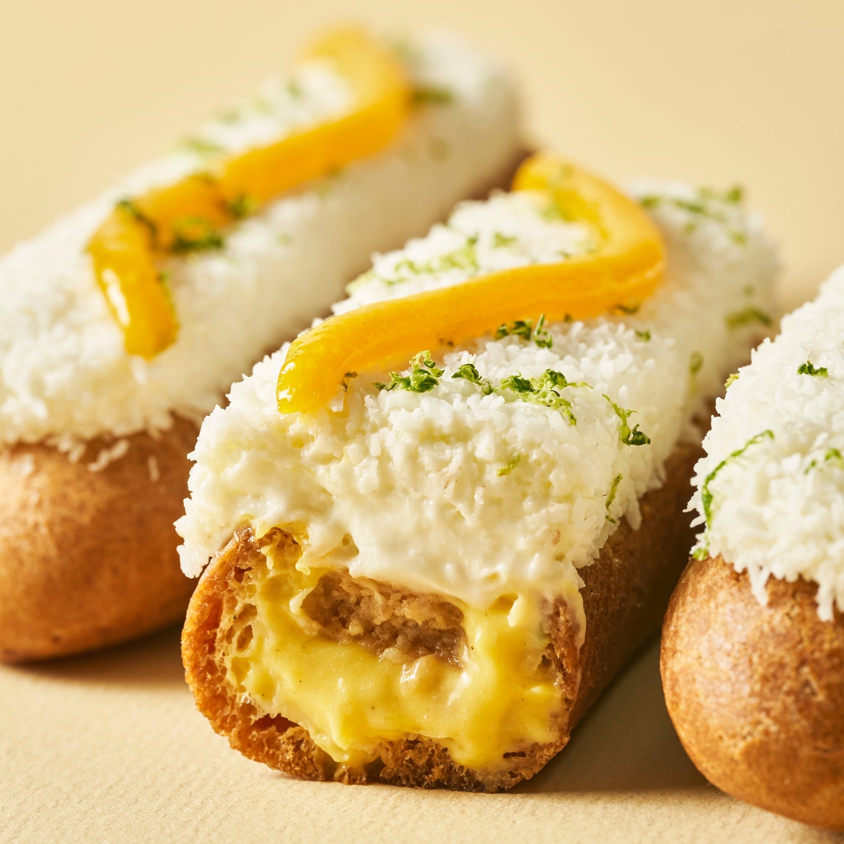 Pâte à choux - crémeux passion avec morceaux de mangue - ganache montée coco - coco râpée - confit passion - croustillant coco