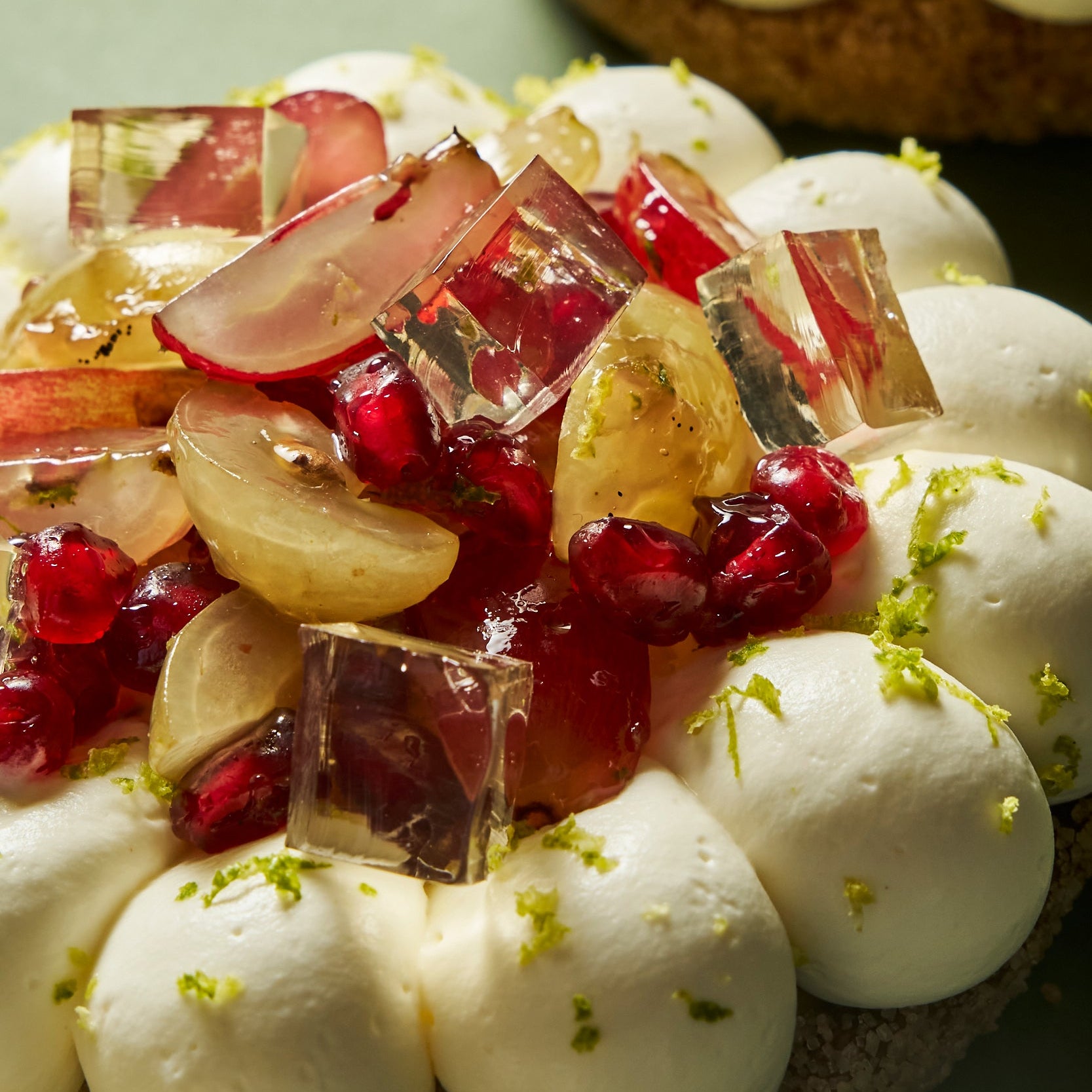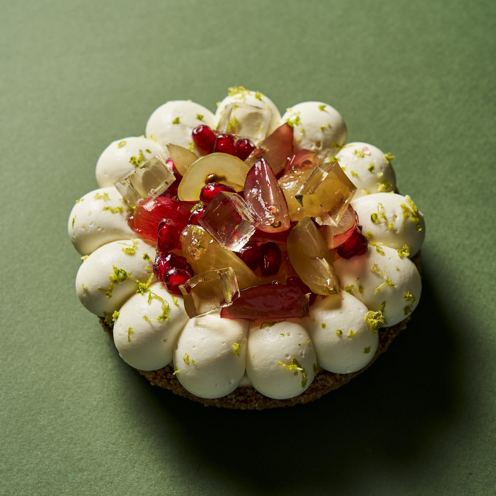 Sur une pâte sablée à la cassonade, un cœur de Champagne se déploie en gelée, confit et crème légère, sublimé par un crémeux citron et la fraîcheur des raisins et de la grenade. Deux cuvées emblématiques, Franck Pascal 2011 et Brut, signent cette audacieuse ode à l’amour et à l’art de vivre épicurien.